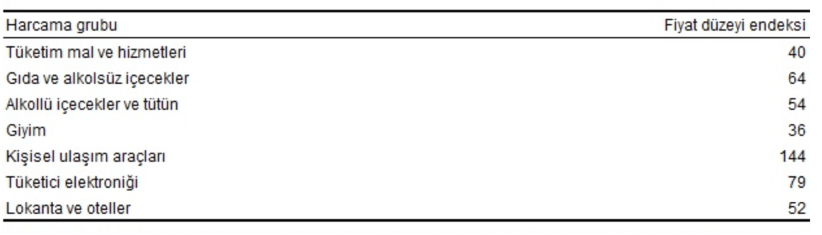 Fiyat düzeyi endeksi ise, ülkelerin ulusal para birimlerinin karşılaştırmalı olarak döviz kuruna göre alım gücünün göstergesi olarak kabul ediliyor. Burada eşik değer 100. Eğer endeks değeri 100’den büyük ise karşılaştırdığımız ülkenin karşılaştırılan ülke grubu ortalamasına göre pahalı” olduğunu, endeks değeri eğer 100’den küçük ise bu kez karşılaştırılan ülkenin karşılaştırıldığı ülke grubu ortalamasına göre “ucuz” olduğunu kabul ediyoruz.